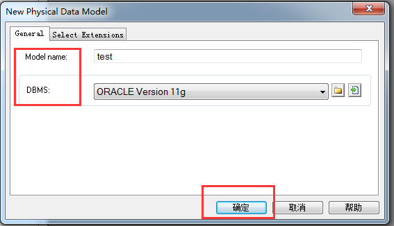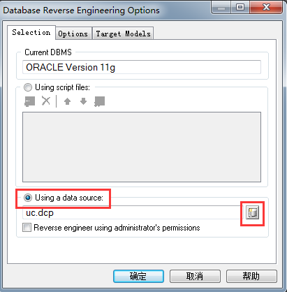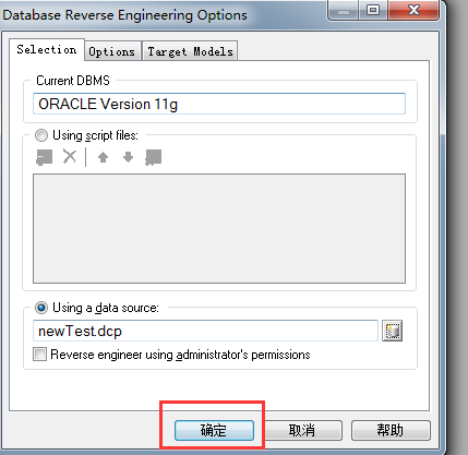 2,新窗口database reverse engineering打开后,填写名称(Model name),选择数据库类型(DBMS,我是Oracle)