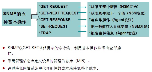 驻留在被管设备上的AGENT从UDP端口161接受来自网管站的报文,经解码、团体名验证、分析得到管理变量在MIB树中对应的节点,从相应的模块中得到管理变量的值,再形成响应报文,编码发送回网管站。网管站得到响应报文后,再经同样的处理,最终显示结果。