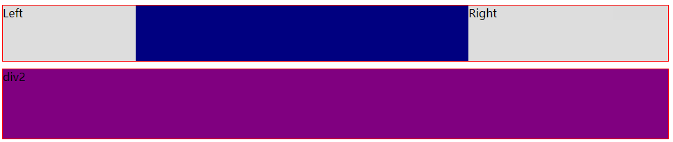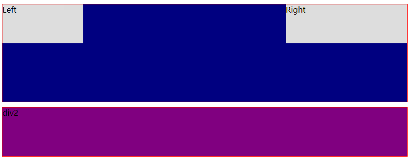 <style type="text/css"> .div1{ background:#000080; border:1px solid red; } .div2{ background:#800080; border:1px solid red; height:100px; margin-top:10px; } .left{ float:left; width:20%; height:80px; background:#DDD } .right{ float:right; width:30%; height:80px; background:#DDD } </style> <div class="div1"> <div class="left">Left</div> <div class="right">Right</div> </div> <div class="div2">div2</div>