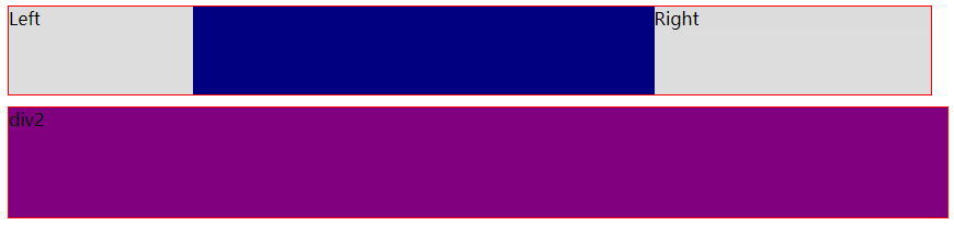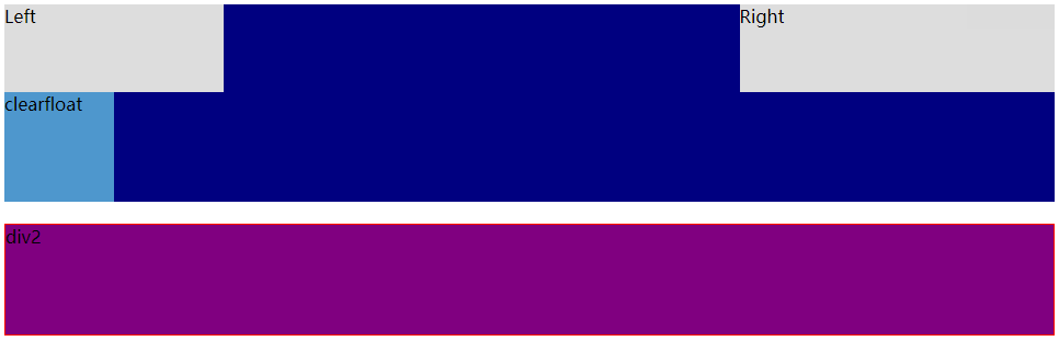 <style type="text/css"> .div1{ background:#000080; border:1px solid red; } .div2{ background:#800080; border:1px solid red; height:100px; margin-top:10px; } .left{ float:left; width:20%; height:80px; background:#DDD } .right{ float:right; width:30%; height:80px; background:#DDD } /*清除浮动代码*/ .clearfloat:after{ content:"";/*设置内容为空*/ height:0;/*高度为0*/ display:block;/*将文本转为块级元素*/ visibility:hidden;/*将元素隐藏*/ clear:both/*清除浮动*/ } .clearfloat{ zoom:1 /*兼容IE*/ } </style> <div class="div1 clearfloat"> <div class="left">Left</div> <div class="right">Right</div> </div> <div class="div2">div2</div>