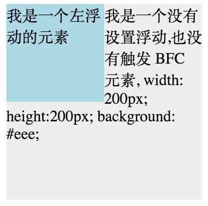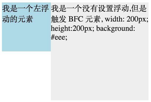 <div style="height: 100px;width: 100px;float: left;background: lightblue">我是一个左浮动的元素</div> <div style="width: 200px; height: 200px;background: #eee">我是一个没有设置浮动, 也没有触发 BFC 元素, width: 200px; height:200px; background: #eee;</div>
