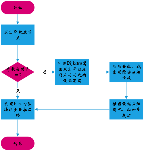 - 用流程图简述解决中国邮递员问题的流程。