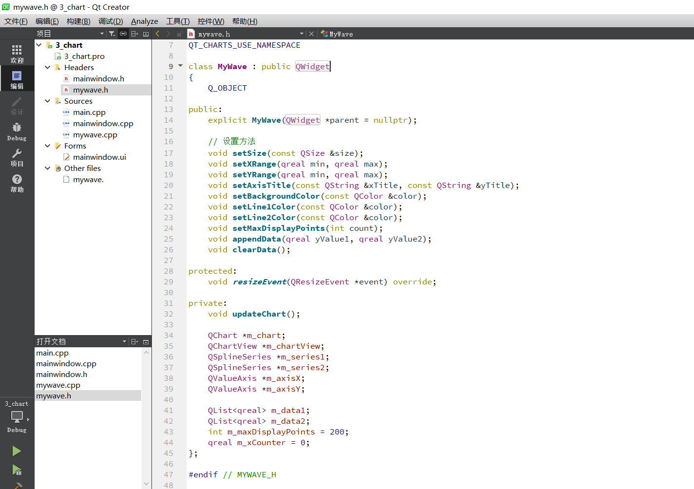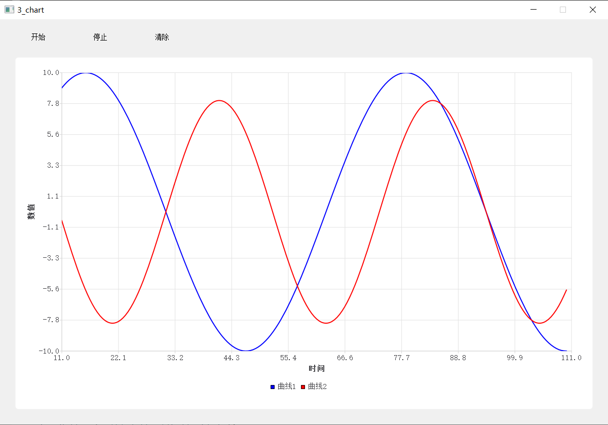 该程序创建了一个主窗口,包含一个可以显示两条实时曲线的图表(MyWave)和三个控制按钮(开始、停止、清除)。通过定时器模拟数据源,动态更新图表,实现了一个简单的波形显示器。