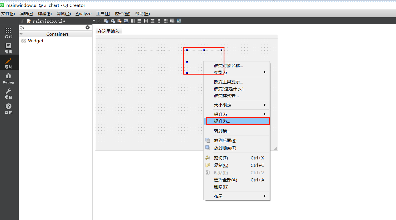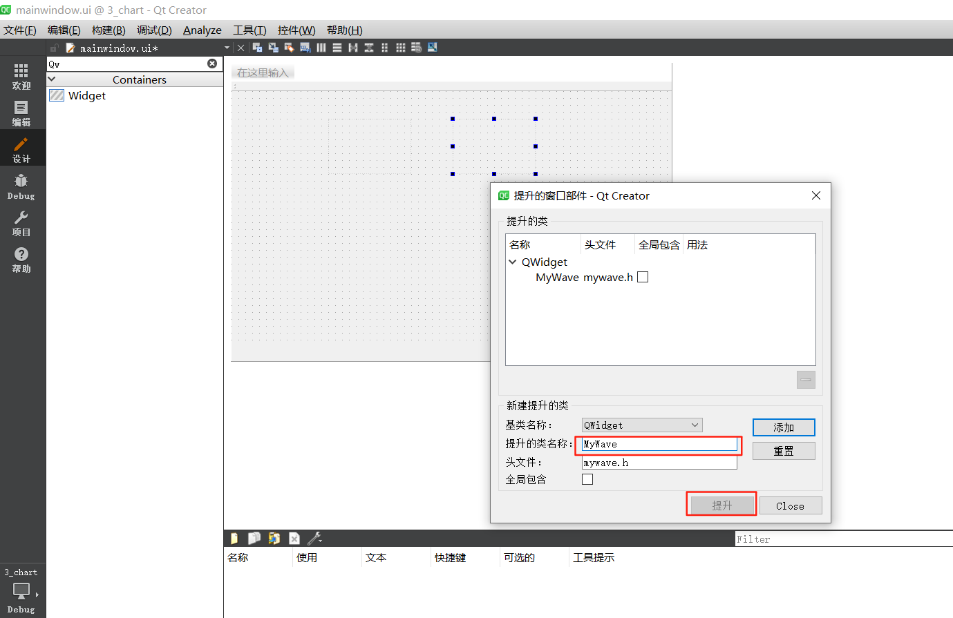 三个按钮为代码中生成,不需要特别注意。mywave需要做出单独的文件创建调用,这里需要拉入Widget控件,然后右键进行提升,为mywave。