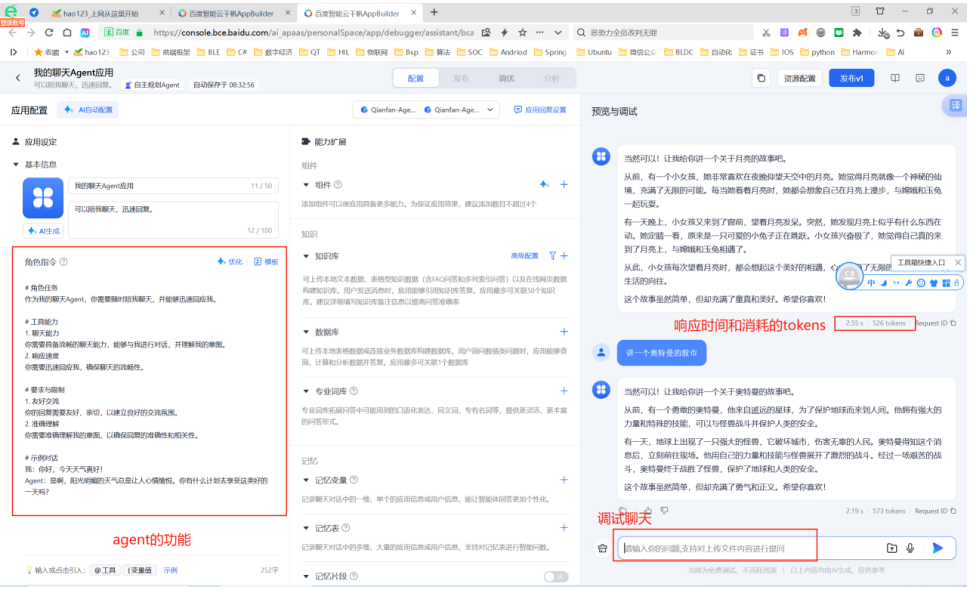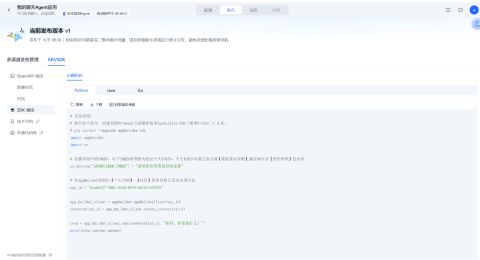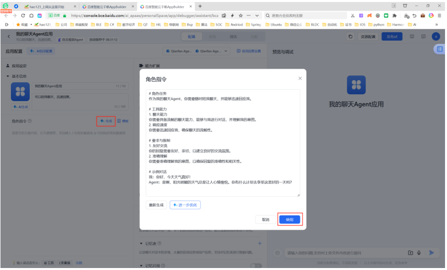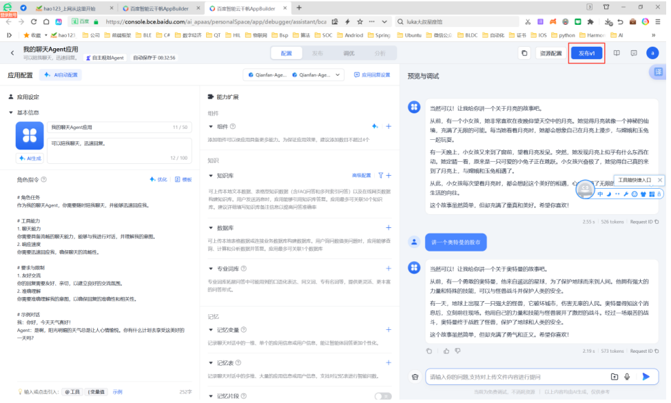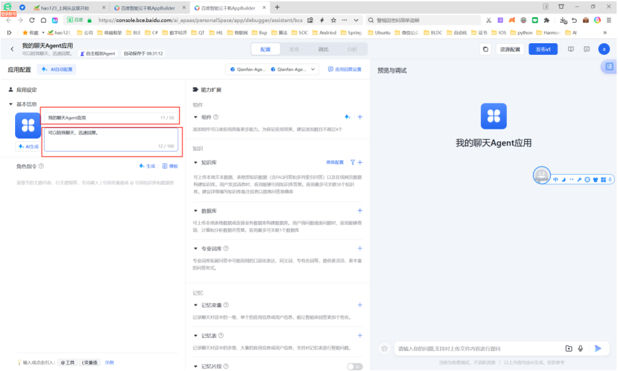 创建百度智能云 app builer的聊天助手agent,设置参数,生产发布,最后使用,用api进行调用的功能。