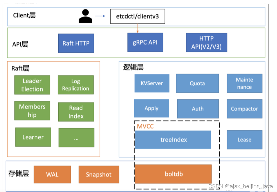 功能逻辑层:etcd 核心特性实现层。如典型的 KVServer 模块、MVCC 模块、Auth 鉴权模块、Lease 租约模块、Compactor 压缩模块等,其中 MVCC 模块主要有 treeIndex 模块和 boltdb 模块组成