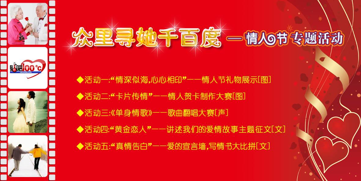 爱若天高似海深,情如地厚比水纯。沧海桑田常变化,唯有真情永长存。 2月14日,又是一年情人节,有人欢喜有人愁。 无论二人相约浪漫,还是一人以烟酒相伴,或疯狂,或遗忘…… 但我们每个人都很明白:爱,永恒不变的话题;情,至死不渝的信念。 在2009年情人节到来之际,我们特地举办“相约贴吧,相约情人节”活动,活动将以“有情人终成眷属”、“没有情人的情人节”、“黄金情人节”三部分组成,无论你属于哪一类人群,相信都能在这里找到属于自己的位置。也许我们不能让你收获爱情,但却希望可以让你收获快乐。 众里寻她千百度,让我们大声的在心里默念那古老而坚定的承诺——生死契阔,与子成说。执子之手,与子偕老。 一、活动时间:2009年1月23日—2009年2月20日 二:活动支持:贴吧•100°C(http://100.baidu.com) 三:活动内容: 【有情人终成眷属】 情深似海,心心相印——情人节礼物Show(分为“情深似海”情人节礼物展示和“心心相印”情人亲手制作礼物展示两部分)[图] 活动链接:http://tieba.baidu.com/f?kz=530167565 【没有情人的情人节】 <真情告白>—情书大比拼,看看谁最肉麻~ 活动链接:http://tieba.baidu.com/f?kz=530169070 【黄金情人节】 黄金恋人,讲述我们的爱情故事——本活动以中老年吧友为主,以征文形式进行,讲述自己的爱情故事[文] 活动链接:http://tieba.baidu.com/f?kz=530170352 【情人节小互动】 情人节《单身情歌》翻唱大赛 活动链接:http://tieba.baidu.com/f?kz=530171714 四、情人节相关贴吧 情人吧 http://tieba.baidu.com/f?kw=%C7%E9%C8%CB 爱吧 http://tieba.baidu.com/f?kw=%B0%AE 爱情吧 http://tieba.baidu.com/f?kw=%B0%AE%C7%E9 情感吧 http://tieba.baidu.com/f?kw=%C7%E9%B8%D0 我爱你吧 http://tieba.baidu.com/f?kw=%CE%D2%B0%AE%C4%E3 单身贵族吧 http://tieba.baidu.com/f?kw=%B5%A5%C9%ED%B9%F3%D7%E5 情书吧 http://tieba.baidu.com/f?kw=%C7%E9%CA%E9 恋爱吧 http://tieba.baidu.com/f?kw=%C1%B5%B0%AE 初恋吧 http://tieba.baidu.com/f?kw=%B3%F5%C1%B5 单身吧 http://tieba.baidu.com/f?kw=%B5%A5%C9%ED 婚姻吧 http://tieba.baidu.com/f?kw=%BB%E9%D2%F6 分手吧 http://tieba.baidu.com/f?kw=%B7%D6%CA%D6 失恋吧 http://tieba.baidu.com/f?kw=%CA%A7%C1%B5 网恋吧 http://tieba.baidu.com/f?kw=%CD%F8%C1%B5 les吧 http://tieba.baidu.com/f?kw=les 50年代吧 http://tieba.baidu.com/f?kw=50%C4%EA%B4%FA 60年代人吧 http://tieba.baidu.com/f?kw=60%C4%EA%B4%FA%C8%CB 70年代吧 http://tieba.baidu.com/f?kw=70%C4%EA%B4%FA 军中绿花吧 http://tieba.baidu.com/f?kw=%BE%FC%D6%D0%C2%CC%BB%A8 更多相关贴吧请见: http://tieba.baidu.com/f?ct=536870912&sn=%C7%E9%B8%D0&bs=%C1%B5%B0%AE&rn=200&pn=0&cm=1101&tn=simpleCategory 原址: http://tieba.baidu.com/f?kz=530178044&bl=jrhd_01
