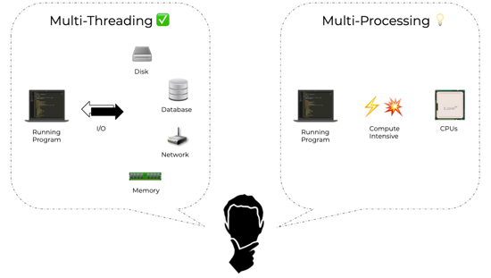 在程序是计算密集型的,且不需要进行任何 IO 或用户交互的情况下,那么多进程就比线程处理更为出色。例如,任何只处理数字的程序都将从多进程中获得巨大的加速;事实上,线程化处理可能会降低它的运行速度。一个有趣的实际例子是 Pytorch Dataloader ,它使用多个子进程将数据加载到 GPU 中。