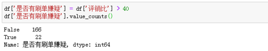 从评销比分布图,可以看出在40处有二次下跌,我们暂且把40(一般也可以尝试平均值)设置为一个筛选阈值,高于阈值的判定为有刷单嫌疑。