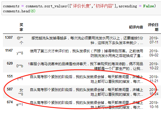 前6条评价,有3个不同的客户,分别在19年的10月16日、24日和21日发表了相同的内容,他们都受高考压力影响,脱发严重,每天房间、床铺、地上掉满他们的头发。