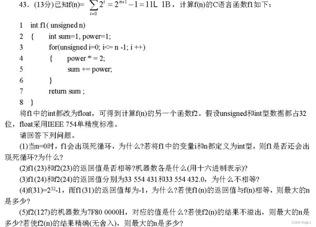(1) n=0时,n-1的机器表示为FFFF FFFFH,而变量i的int类型所能表示的最大真值为7FFF FFFFH,则i++无论如何执行,也无法大于n-1,发生死循环。i和n定义为int型,f1不会出现死循环,因为i的机器表示可以达到8000 0000H,此时真值小于-1。