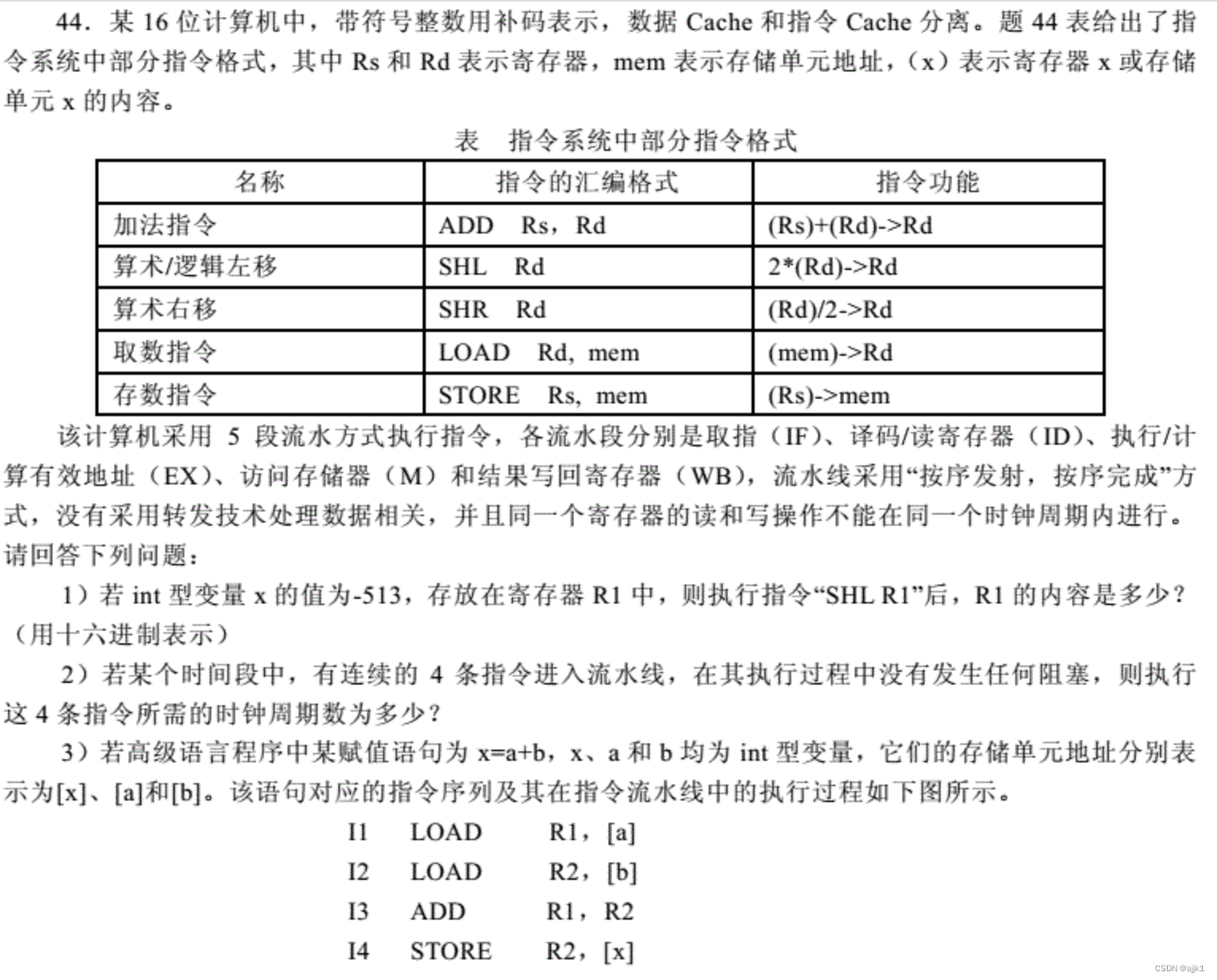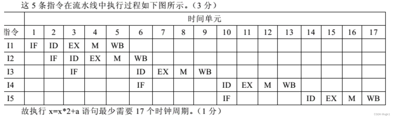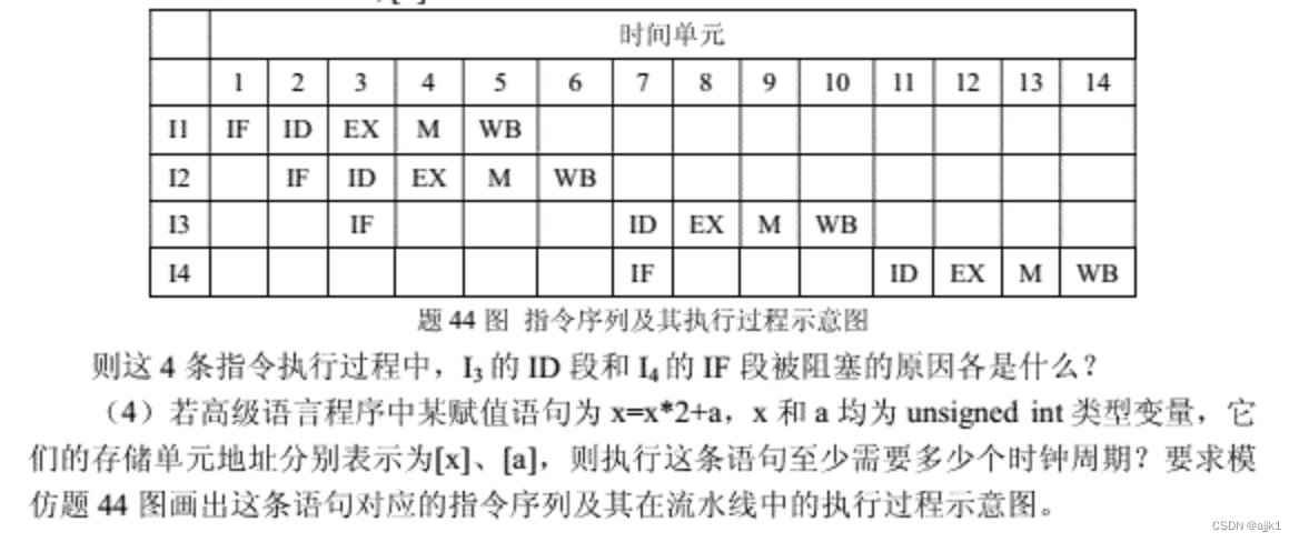 (3) I1,I2,I3会发生数据相关,为了避免数据冲突,阻塞I3的ID段直到I1,I2指令执行完毕后.I4的IF段被阻塞,是因为I3还在被阻塞,指令寄存器IR中保存着I3的内容,阻塞I4的IF段防止IR中内容被覆盖.