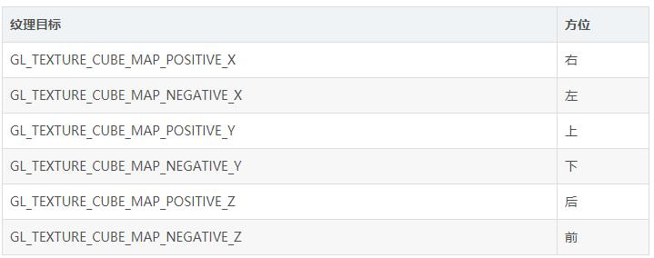 与2D纹理区别不大,创建立方体贴图同样是创建纹理,只是我们的glBindTexture的方法的参数要变为GLES20.GL_TEXTURE_CUBE_MAP,然后同样要处理环绕和过滤方式。与2D纹理不同的是,它需要用6张图片来分别设置立方体的六个面,同样是使用GLUtils.texImage2D方法,它的target参数如下表