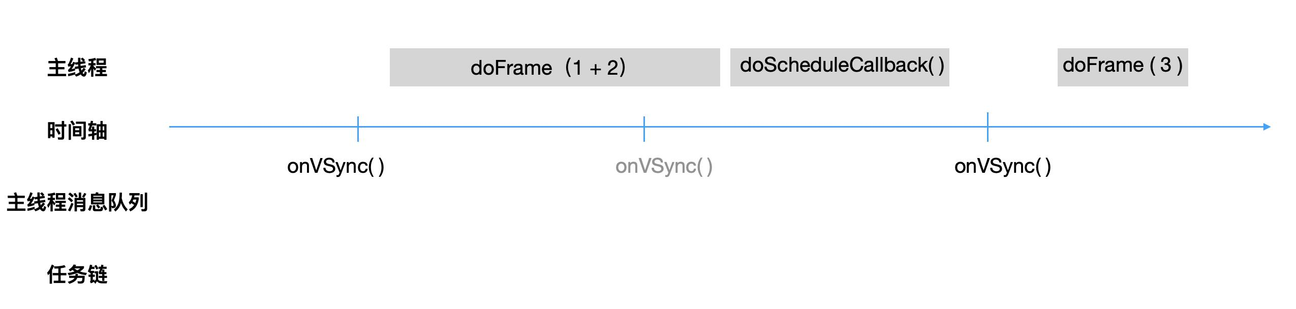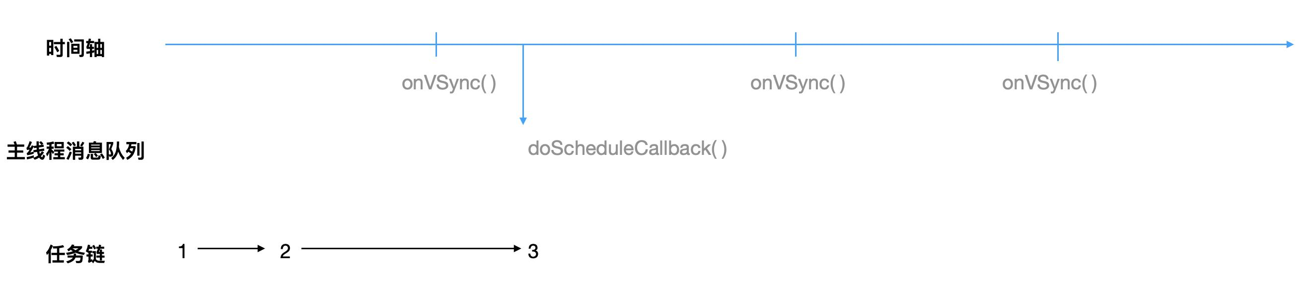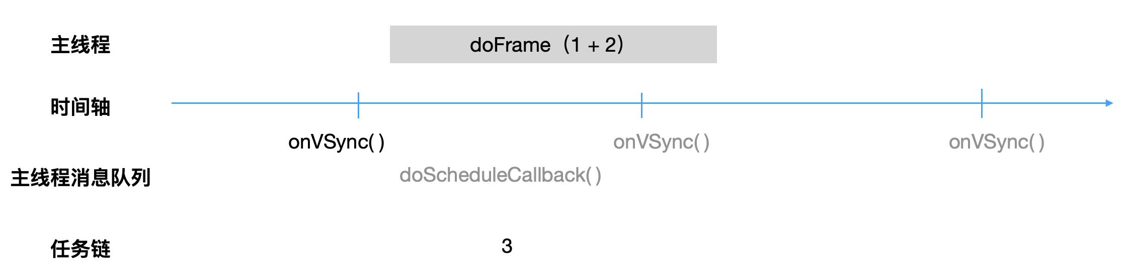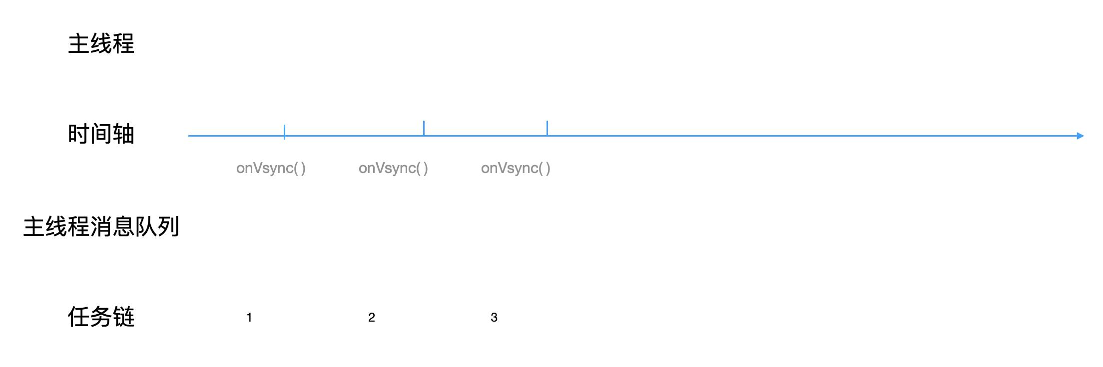 假设第一个垂直同步信号到来前,上层已经抛了3个绘制任务到任务链中,它们执行的时刻分别被设定于第一、二、三个垂直同步信号之间。