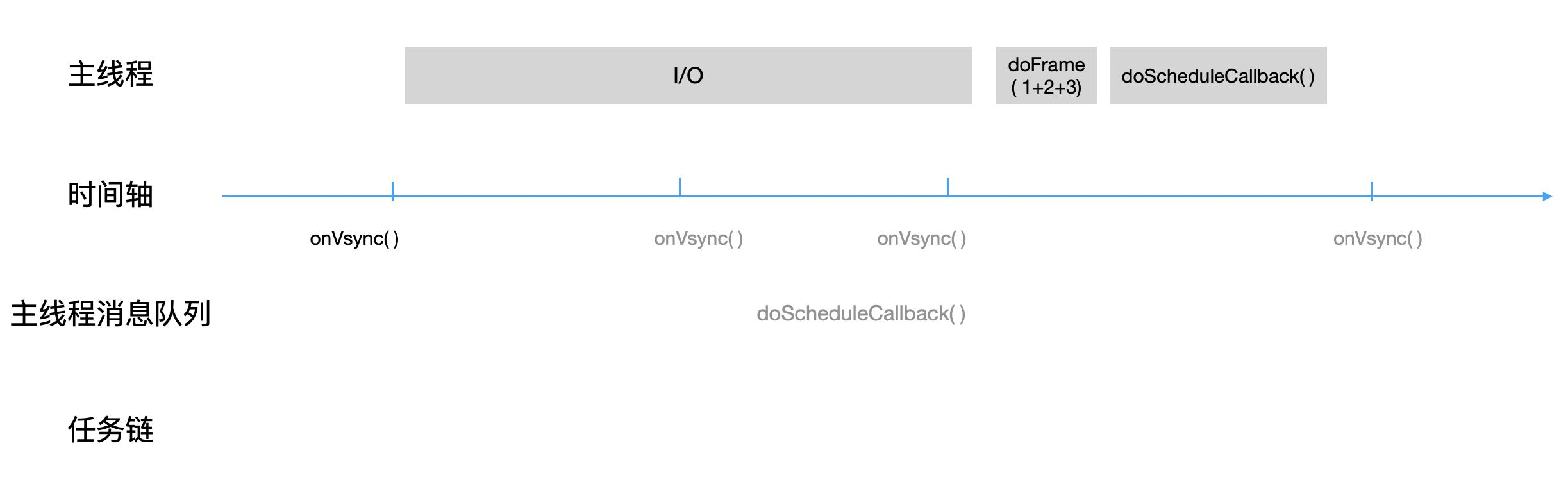 当第一个垂直同步信号到来时,doFrame()被抛到主线程消息队列,但主线程被一个 I/O 任务占用着,遂doFrame()一直没有得到执行机会。而且订阅后续信号的函数也无法被执行,所以第二、三个onVsync()不会被调用,直到 I/O 操作执行完毕。