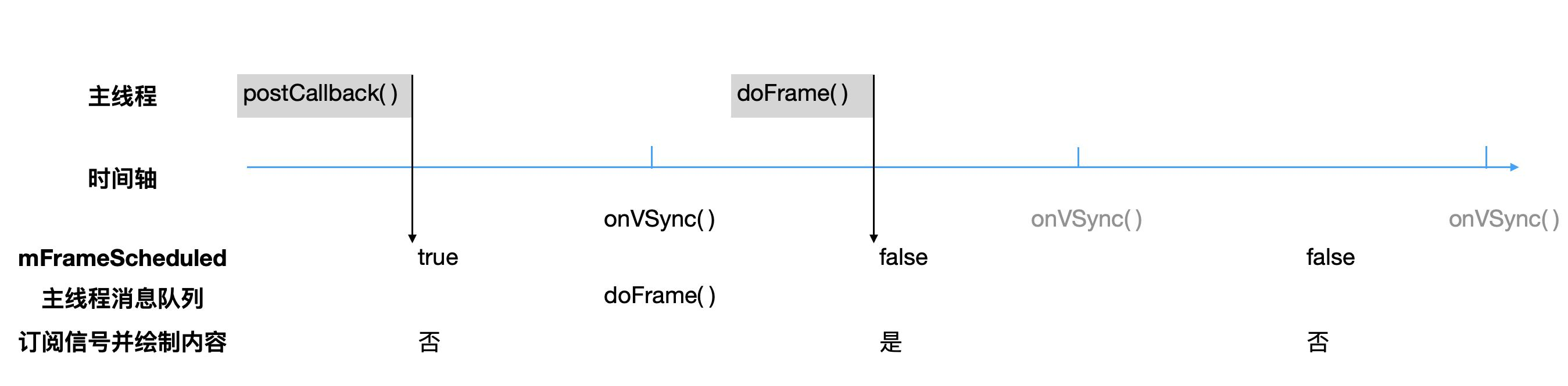 // 垂直信号到达时刻会和doFrame()一起被抛到主线程