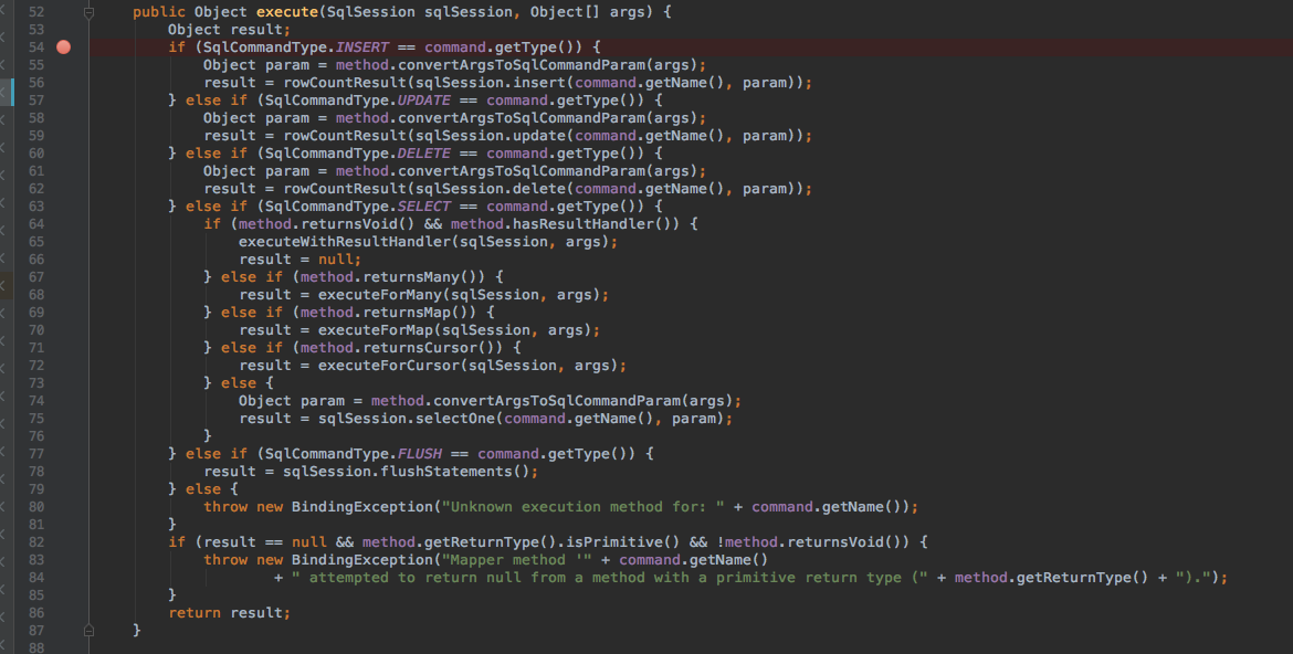 从之前的学习中我已经知道MapperProxy是Mapper的动态代理实现,他的invoke方法会调用MapperMethod的execute方法.所以我们来看看这个execute方法