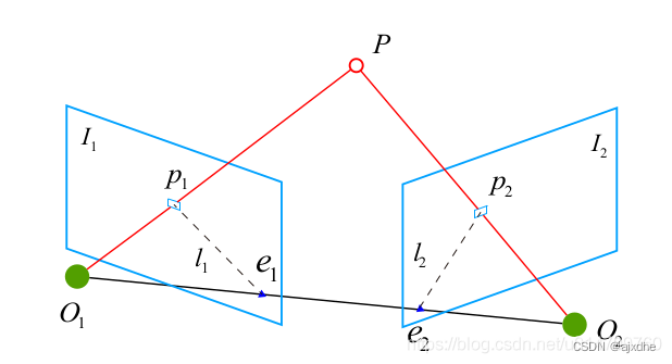 首先,连线 O1p1 和连线 O2p2 在三维空间中会相交于点 P 。这时候点O1 , O2 , P 三个点可以确定一个平面,称为极平面(Epipolar plane)。O1O2 连线与像平面 I1 , I2 的交点分为 e1 , e2 。e1 , e2 ,称为极点(Epipoles),O1O2 被称为基线(Baseline)。称极平面与两个像平面 I1 , I2 之间的相交线 L1 , L2 为极线(Epipolar line)。