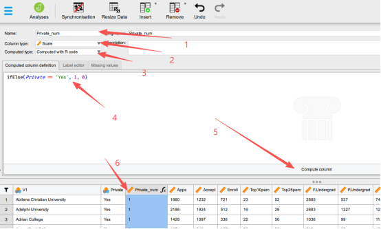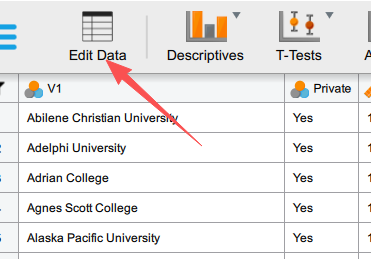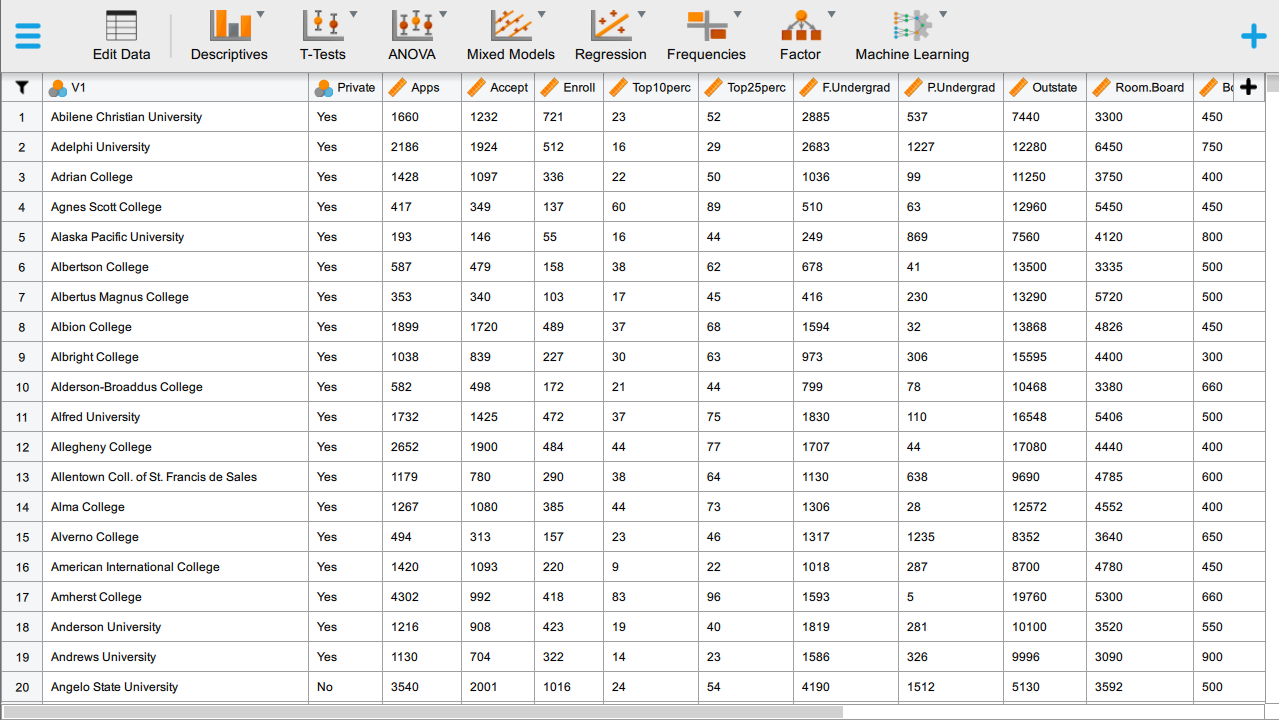 2. JASP 会自动识别数据集的格式和内容,并将其加载到软件中。你可以在数据表格区域看到数据集的基本信息,包括列名、数据类型以及前几行内容。在这个数据集中,我们可以看到像 `Private`(是否私立学校,取值为 Yes 或 No)、`Apps`(申请人数)、`Accept`(录取人数)等列。