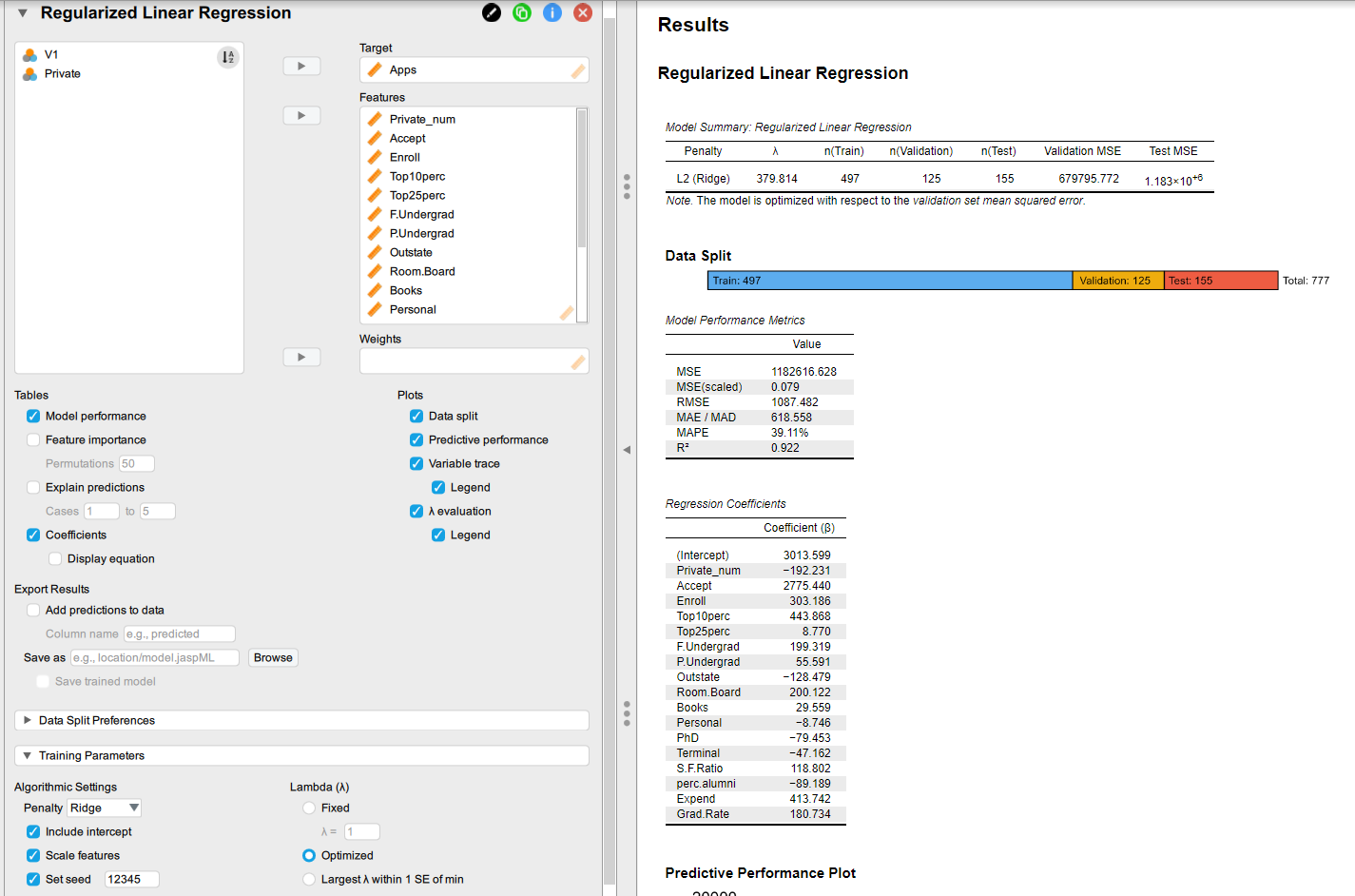 1. 我们先对数据集中的一些数值型变量进行描述性统计分析。在 JASP 界面左侧的变量列表中,选中想要分析的变量,例如 `Apps`(申请人数)和 `Enroll`(实际入学人数)。