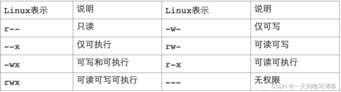 即r表示有读权限,w表示有些权限,x表示有执行权限,-表示没有对应的权限。