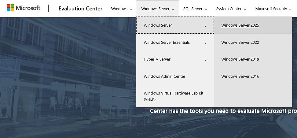 - 在评估中心页面,点击顶部水平菜单中的 Windows Server。 然后选择 Windows Server 选项。 从可用版本列表中,选择 Windows Server 2025,如图 1.13 所示。 .