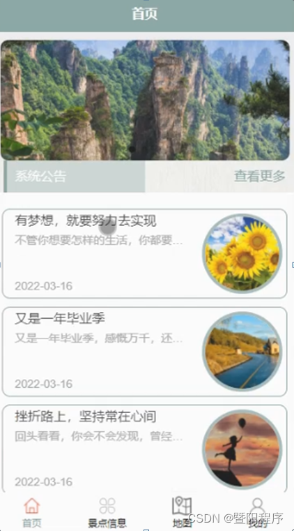 前台功能:用户进入系统可以实现首页,景点信息,系统公告,地图,我的等进行操作;