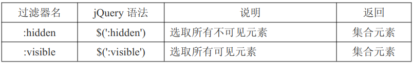 注意::hidden 过滤器一般是包含的内容为:CSS 样式为 display:none、input 表单类型为type="hidden"和 visibility:hidden 的元素。
