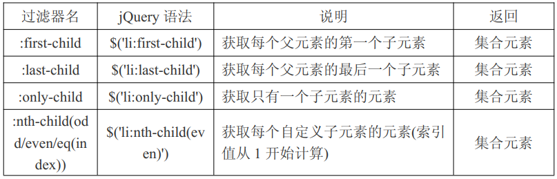 子元素过滤器的过滤规则是通过父元素和子元素的关系来获取相应的元素。