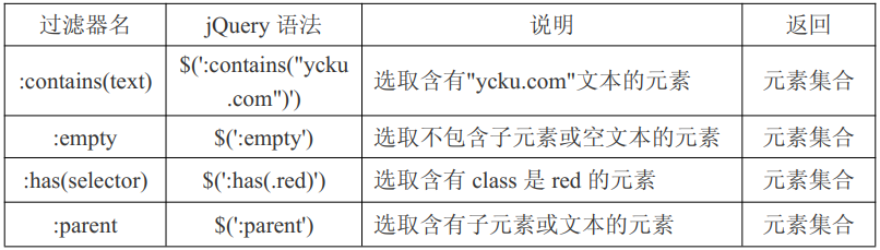 //选择元素文本节点含有 ycku.com 文本的元素 $('div:contains("ycku.com")').css('background', '#ccc'); $('div:empty').css('background', '#ccc'); //选择空元素 $('ul:has(.red)').css('background', '#ccc'); //选择子元素含有 class 是 red 的元素 $(':parent').css('background', '#ccc'); //选择非空元素