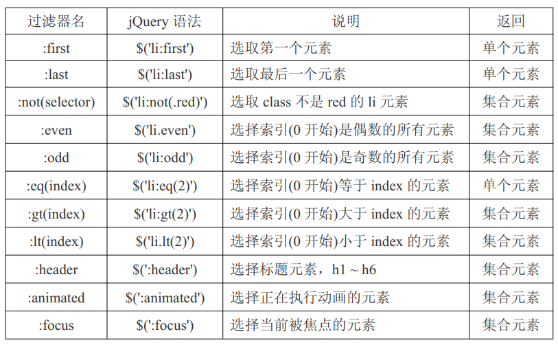 过滤器主要通过特定的过滤规则来筛选所需的 DOM 元素,和 CSS 中的伪类的语法类似:使用冒号(:)开头。