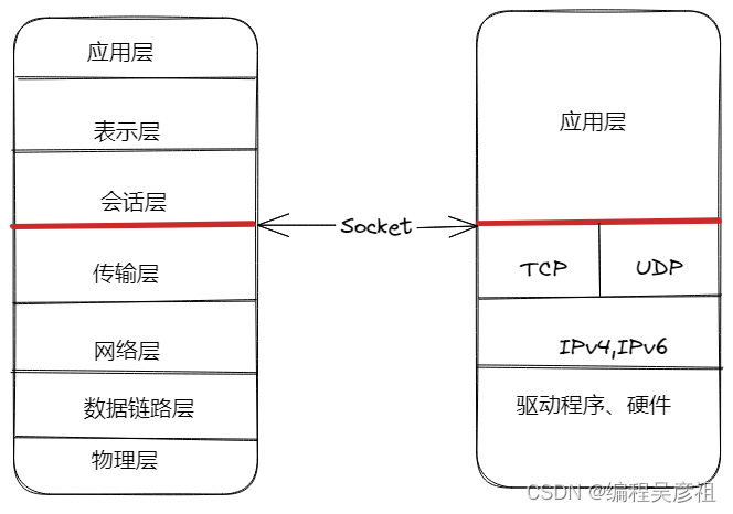 从百科的描述,不难看出Socket处在传输层和应用层之间,是应用程序与网络协议栈进行交互的接口。它在OSI七层模型/网际协议层 的位置如下图所示