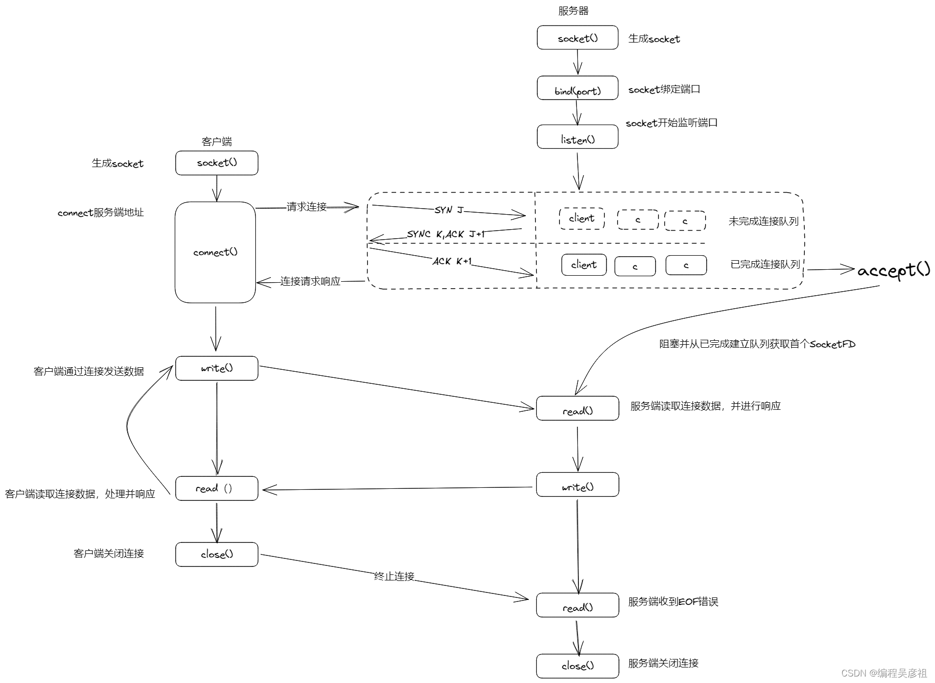 图二中服务端执行listen函数,服务端Socket状态从CLOSED转为LISTEN状态。