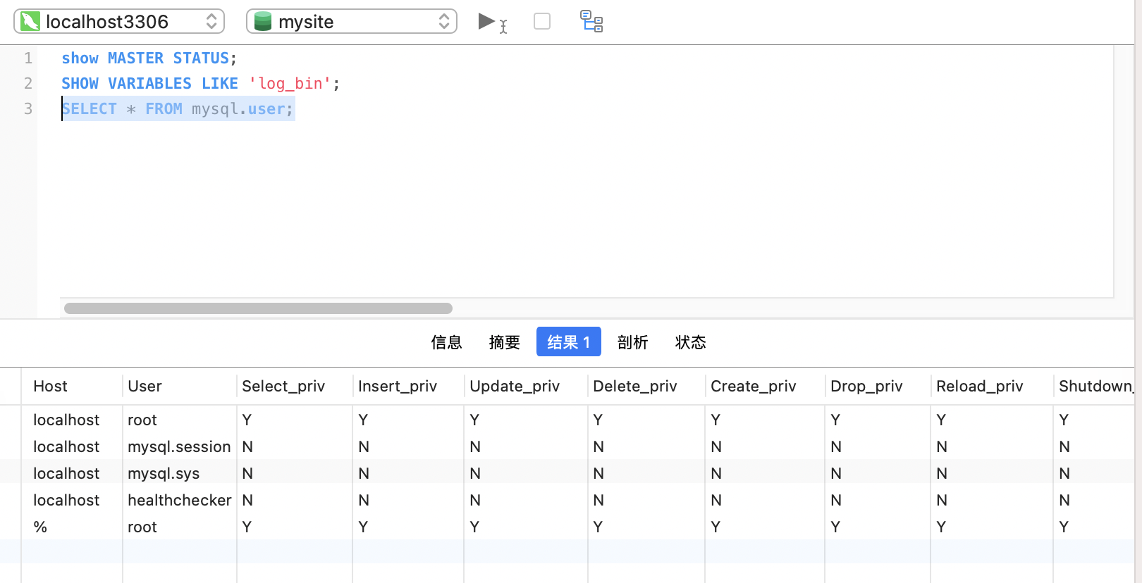 [删除canal用户,可忽略] DROP USER IF EXISTS 'canal'@'%'; CREATE USER 'canal'@'%' IDENTIFIED BY 'canal'; GRANT ALL PRIVILEGES ON *.* TO 'canal'@'%' IDENTIFIED BY 'canal'; FLUSH PRIVILEGES; [查看是否添加成功] SELECT * FROM mysql.user;