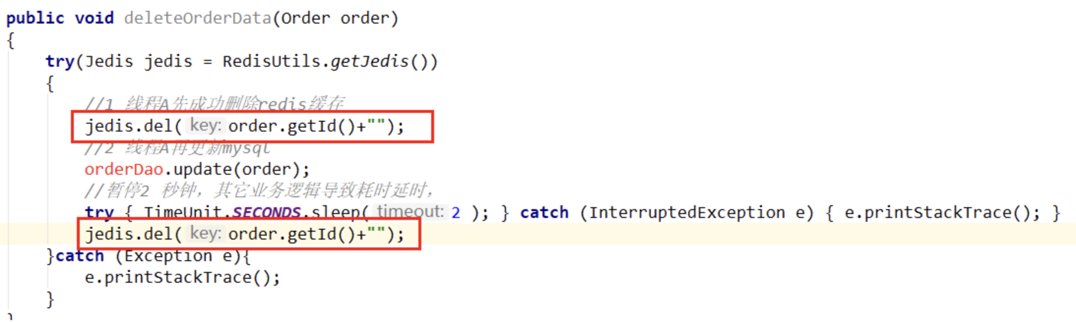加上sleep的这段时间,就是为了让线程B能够先从数据库读取数据,再把缺失的数据写入缓存,然后,线程A再进行删除。所以,线程Asleep的时间,就需要大于线程B读取数据再写入缓存的时间。这样一来,其它线程读取数据时,会发现缓存缺失,所以会从数据库中读取最新值。因为这个方案会在第次删除缓存值后,延迟一段时间再次进行删除,所以我们也把它叫做“延迟双删”