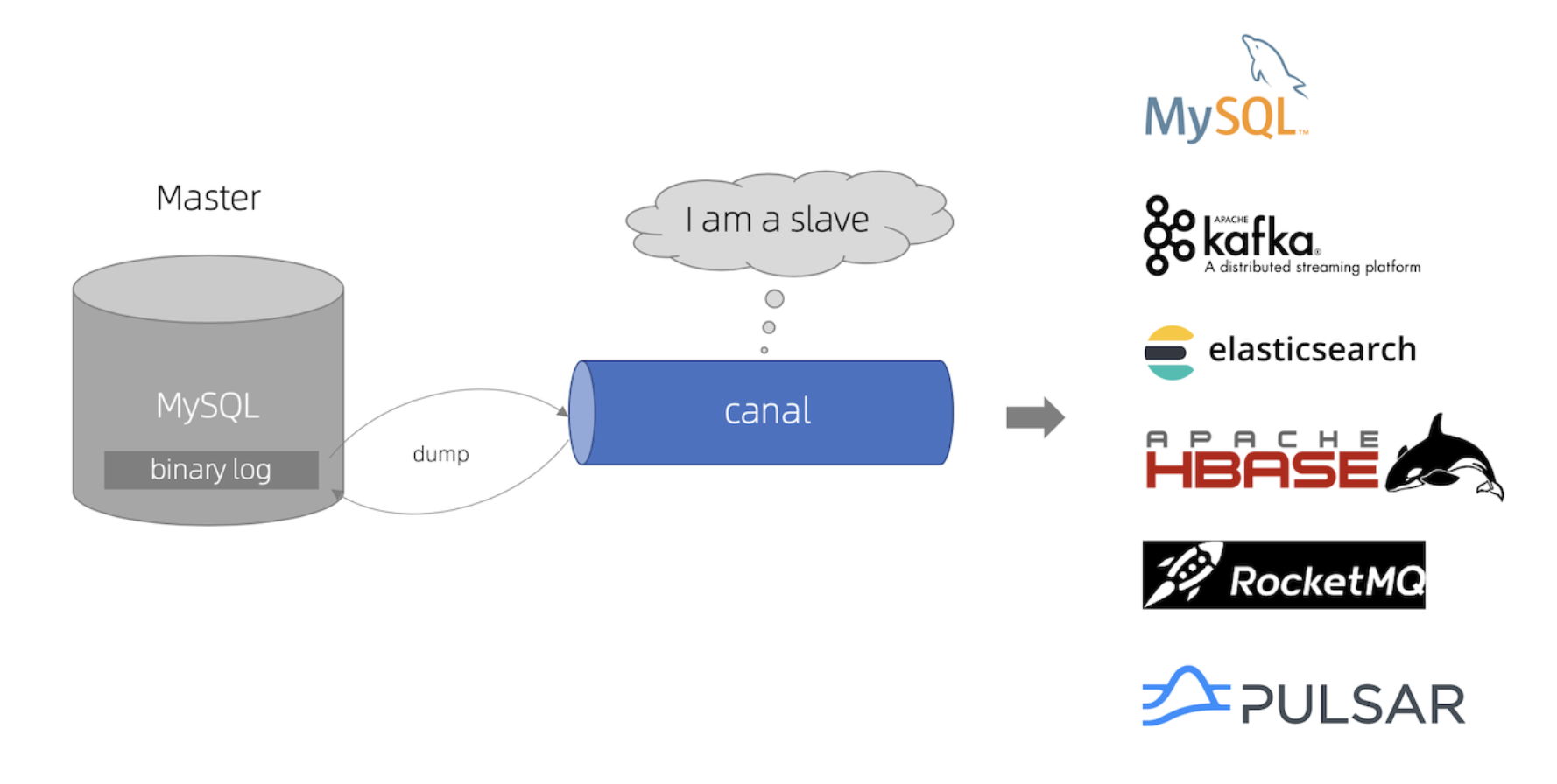 canal 模拟 MySQL slave 的交互协议,伪装自己为 MySQL slave,向 MySQL master 发送dump 协议