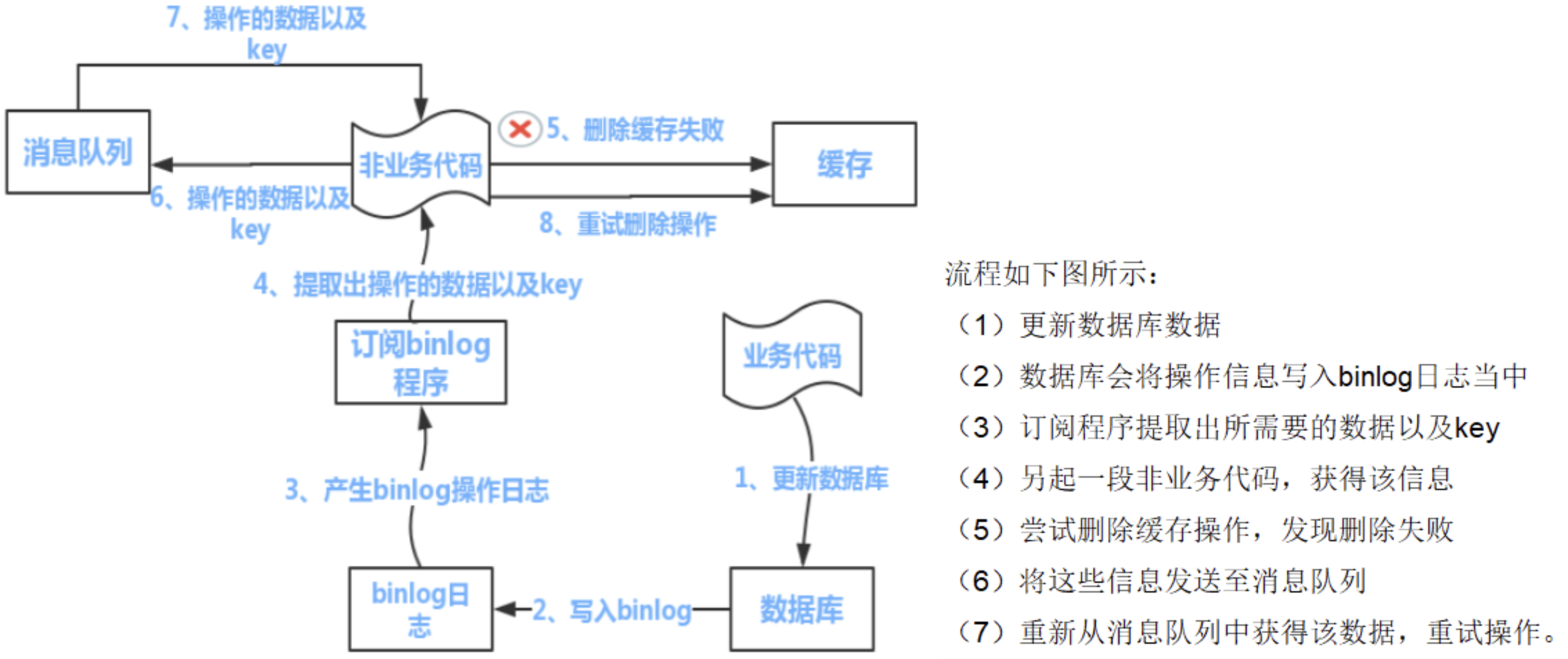 当程序没有能够成功地删除缓存值或者是更新数据库值时,可以从消息队列中重新读取这些值,然后再次进行删除或更新。
