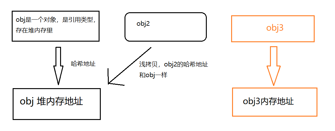obj2是对obj的浅拷贝,obj2新建了一个对象,但是obj2对象复制的是obj的指针,也就是obj1的堆内存地址,而不是复制对象本身。obj和obj2是共用了内存地址的。