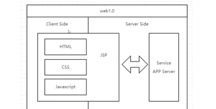 在web1.0时代,并没有前端的概念。开发一个web应用多数采用ASP.NET/Java/PHP编写,文件中同时包含了HTML、CSS、JavaScript、C#/Java/PHP代码,系统整体架构可能是这样子的: