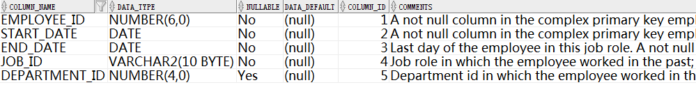 1 --5. 列出同部门中工资高于1000 的员工数量超过2 人的部门,显示部门名字、地区名称。 2 -- 工资大于1000 count(1)>2 3 -- 部门名称 地区 需要 departments和locations表关联 4 --先把employees departments locations三表关联起来 5 -- 分组使用department_id和city 6 -- having 过滤分组后的结果 7 SELECT d.DEPARTMENT_NAME,l.CITY,count(1) FROM EMPLOYEES e,DEPARTMENTS d,LOCATIONS l WHERE e.DEPARTMENT_ID=d.DEPARTMENT_ID AND d.LOCATION_ID=l.LOCATION_ID AND e.SALARY>1000 GROUP BY d.DEPARTMENT_NAME,l.CITY HAVING COUNT(1)>2;