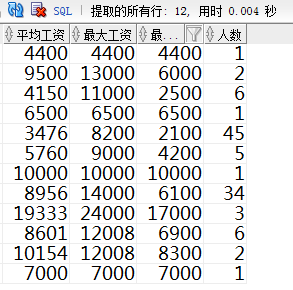 3 SELECT ROUND(AVG(e.SALARY)) 平均工资,MAX(e.SALARY) 最大工资,MIN(e.SALARY) 最小工资,count(1) 人数 FROM EMPLOYEES e GROUP BY e.DEPARTMENT_ID ORDER BY e.DEPARTMENT_ID ASC;
