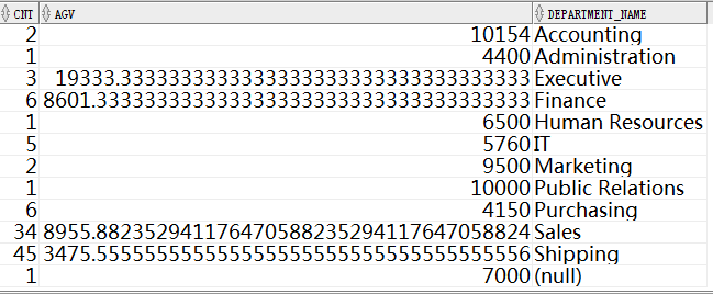 6 SELECT count(1) cnt,AVG(e.SALARY) agv,(SELECT d.DEPARTMENT_NAME FROM DEPARTMENTS d WHERE d.DEPARTMENT_ID=e.DEPARTMENT_ID) department_name FROM EMPLOYEES e GROUP BY e.DEPARTMENT_ID;