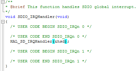 在这里cube的画面配置环节就不描述了,直接描述所碰问题:文件系统无法挂载或文件无法读写,而且调式的时候光标移到读取时会跑飞等一些列问题。其实针对于这一问题主要是处理SD的信息接受与发送的中断调用有问题,我们可以进入SD的中断函数中进行分析,该函数在stm32f4xx_it.c文件中,如下图所示: