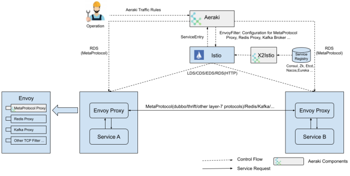 Aeraki Mesh可看做一个非侵入式 Istio 功能增强工具集,用户可以在服务网格中管理任何七层协议。目前已经支持Dubbo、Thrit、Redis、Kafka、ZooKeeper 等开源协议。除此之外,用户还可以通过 Aeraki Mesh对私有协议的七层流量进行管理。