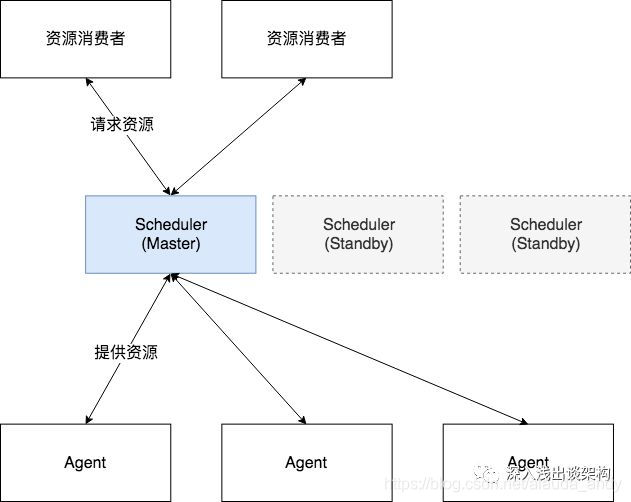 所有的集群调度系统的架构都是无法横向扩展的,如果需要管理更多的服务器,唯一的办法就是创建多个集群。集群调度系统的架构看起来都是这个样子的:
