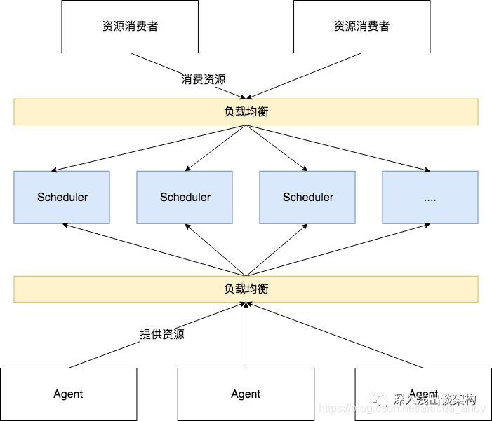 中间的 Scheduler(资源调度器)是最核心的组件,虽然通常是由多个(通常是3个)实例组成,但是都是单活的,也就是说只有一个节点工作,其他节点都处于 Standby 的状态。为什么会这样呢?看起来不符合互联网应用的架构设计原则,现在大部分互联网的应用通过一些分布式的技术,能够很容易的实现横向扩展,比如电商应用,促销时,通过往集群里面添加服务器,就能够提升服务的吞吐量。如果是按照互联网应用的架构,看起来应该是这样的:
