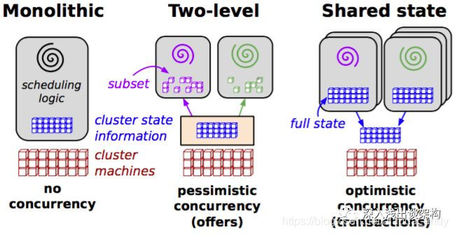 在 Google 的一篇关于内部 Omega 调度系统的论文中,将调度系统分成三类:单体、二层调度和共享状态三种,按照它的分类方法,通常Google的 Borg被分到单体这一类,Mesos被当做二层调度,而Google自己的Omega被当做第三类“共享状态”。