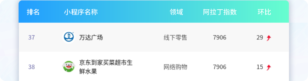 本月阿拉丁指数百强中,网络购物和线下零售累计入榜小程序 26 个,其中 14 个小程序排名上升。京东到家、万达广场等多个小程序表现优秀。