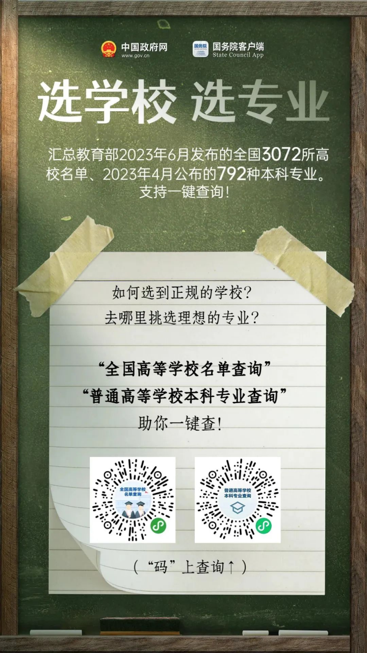 “国务院客户端”于 6 月下旬推出了“全国高等学校名单查询”服务,微信用户扫码进入国务院客户端小程序后,选择【所在地】或【普通高等学校/成人高等学校】即可筛选高校,搜索学校名称或主管部门还能了解相关信息;在专业选择服务方面,小程序提供了按【基本专业】、【特设专业】和【学科门类】三种查询方式,考生和家长可以按需操作。