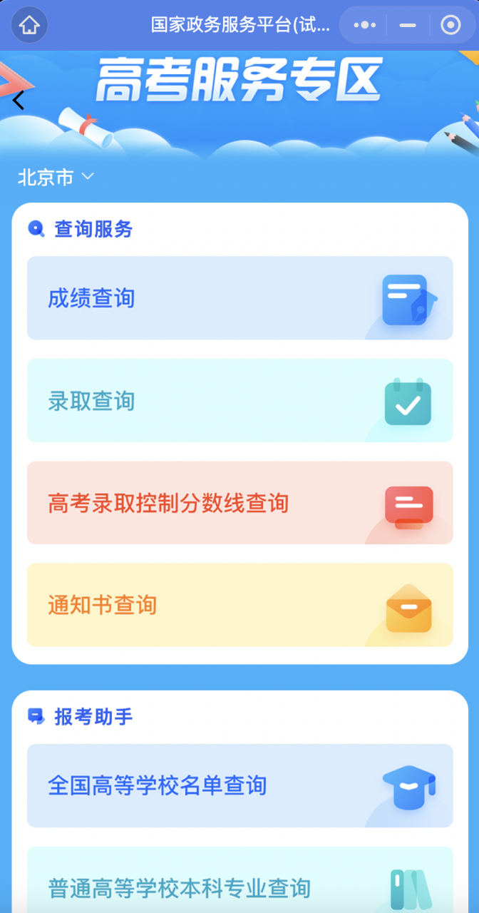 另一个政务小程序“国家政务服务平台”开辟了“高考服务专区”,提供录取控制分数线、录取通知书、全国高等学校名单和本科专业等多项查询服务。